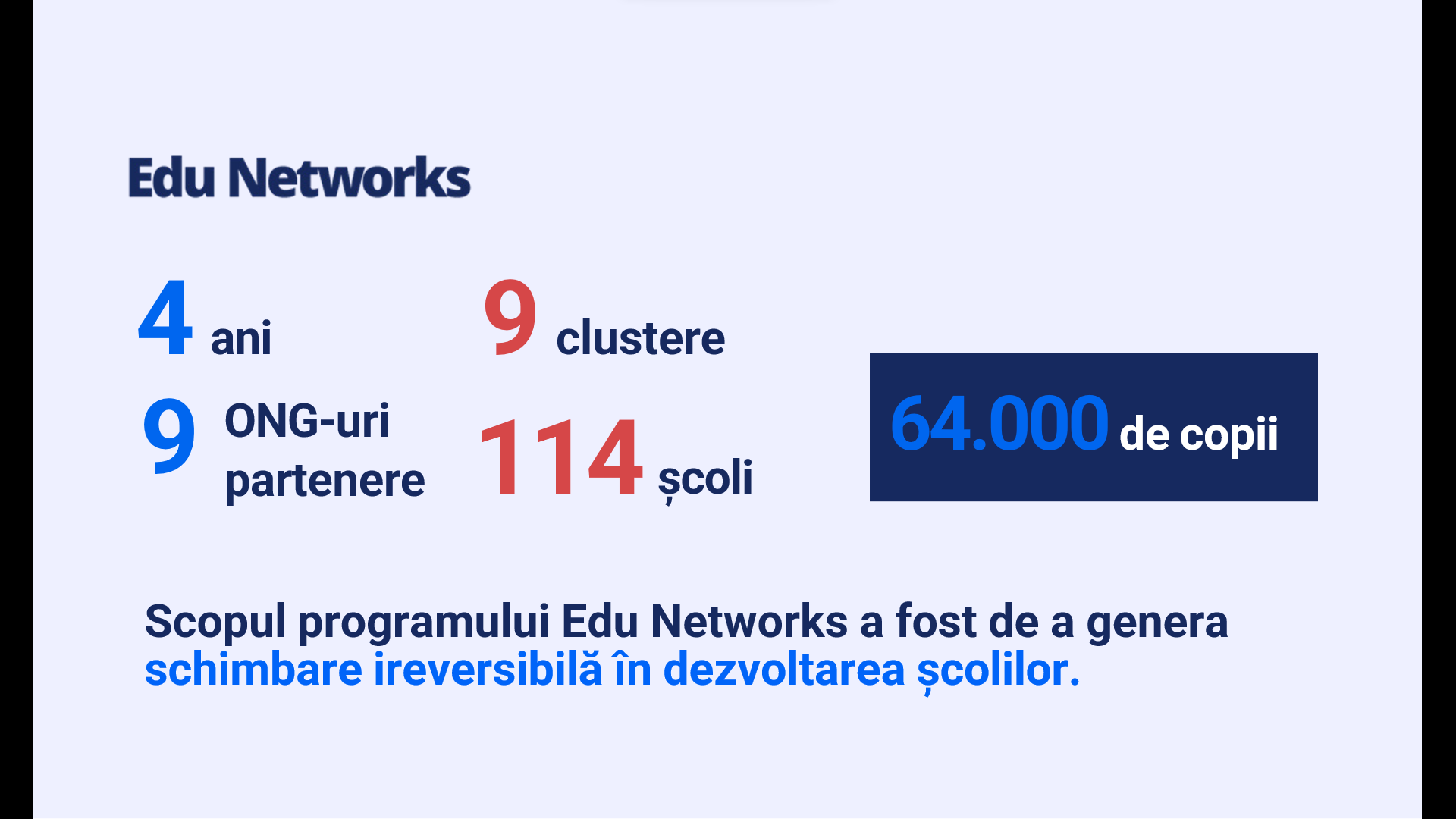 The goal of Edu Networks was to bring together, as part of a coordinated effort, 9 educational organisations intent on generating change across the development of schools through systemic and long-lasting organisational transformations and on having a nationwide impact. The schools involved in Edu Networks were organised, on a national level, into nine clusters, keeping in mind the geographic proximity among them: Bacău, Bistrița-Năsăud, Brad, Bucharest-Ilfov, Buzău, Dâmbovița, Galați, Olt and Valea Jiului.